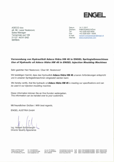 ООО “ADECO” – компания, занимающаяся производством моторных и индустриальных масел, а также специальных жидкостей для автомобилей, механизацию и промышленность, основана 26 декабря 1991 года в городе Нови Сад.